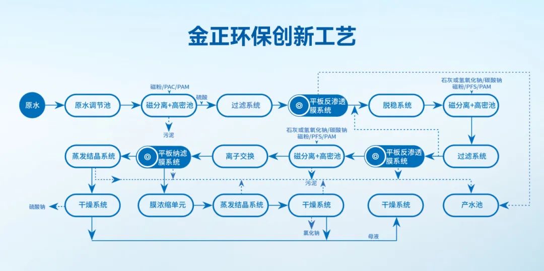 金正環保煤礦礦井水零排放及資源化利用解決方案,以更短、更高效的流程實現礦井水深度處理及資源化利用,為煤礦及煤化工企業提供運行成本低、固廢產出量少、膜系統運行穩定的創新工藝。該工藝分為四個工藝段,依次是預濃縮工藝段、脫穩濃縮工藝段、深度濃縮工藝段、蒸發結晶工藝段。各工藝段可根據來水水量、水質進行不同的裝備和工藝組合,實現模塊化、標準化運行,有效解決傳統卷式膜元件易污堵問題,實現高倍濃縮和分鹽,減少蒸發量,大大降低蒸發投資及運行成本,保證系統整體穩定運行。相比傳統工藝,藥劑用量減少≥80%,軟化污泥產量減少≥60%,去除鈣離子≥70%,成本降低≥60%。